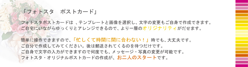 ![]() 自分で作るから楽しい!!画像や文字を自由に変更して楽しくハンドメイド・・・ フォトスタ ポストカードは新しくデザインテンプレートが、これからも順に追加されていきます。 お好きなテンプレートを選んで自由にメッセージを入れてください。 拡大画像はクリックしてください。