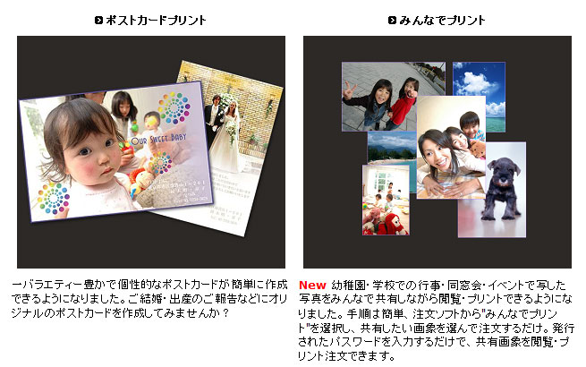 ネットもお店も「注文ソフト」は画面も操作も全く同じ全部で8種類・27サイズのプリントと「写真とTVで見る」「動画をTVで見る」などの「DVD・CD変換・保存サービス」が注文できます。 お店で一度操作を覚えれば、その後は自宅から簡単・ラクチンにプリント注文できます。